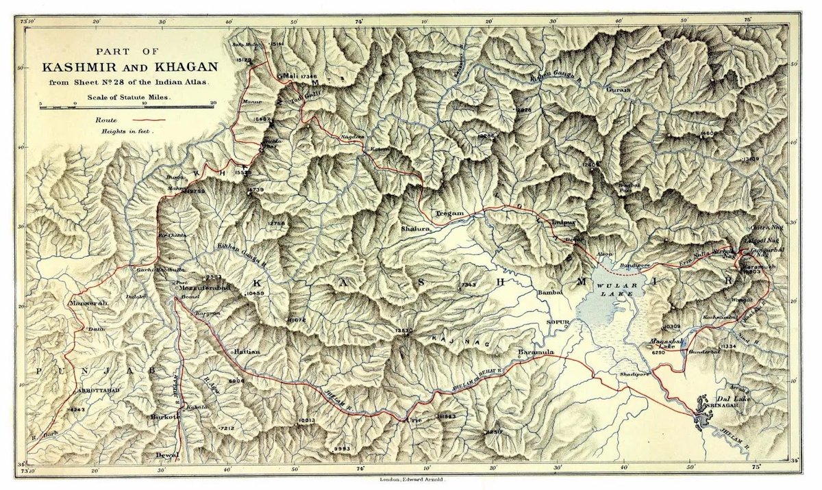 1: Auriel Stein’s map of anicent Srinagar, 1898. 2: Jammu and Kashmir by Ashley Carus-Wilson, 1901. 3: Provincial geographies of India, 1913. 4: From ‘A Handbook for travellers in India, Pakistan, Burma and Ceylon’ by publishing firm, John Murray, 1901. (4/n)