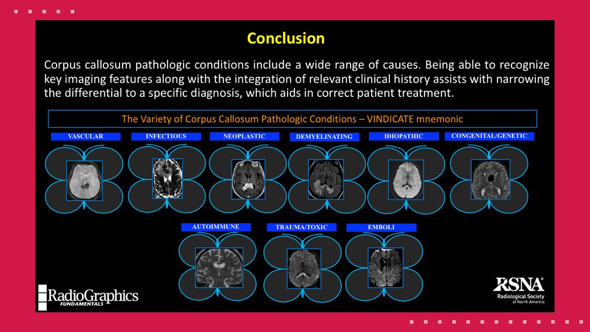 This modified VINDICATE mnemonic provides a useful framework for approaching lesions of the corpus callosum.