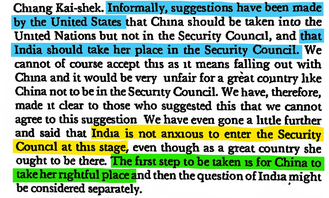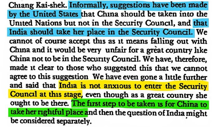 "Informally, suggestions have been made by the United States that China should be taken into the United Nations but not in the Security Council, and that India should take her place in the Security Council. We cannot of course accept..."