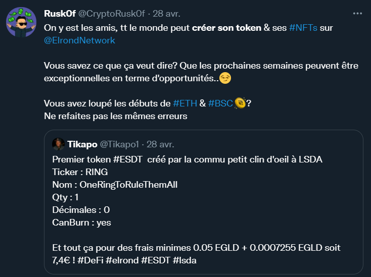 - L'utilité/projet : Un écosystème qui héberge à la fois des appli de paiement et de finance décentralisée. Le projet Elrond pourrait être considéré comme un concurrent sérieux de Ethereum.