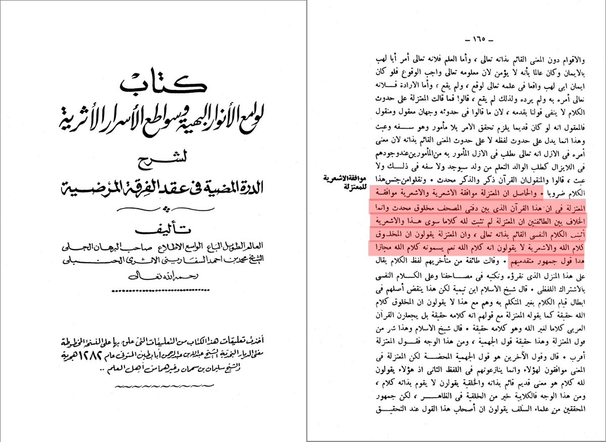 The only difference between the two factions is that the Mu’tazilah did not affirm any other Speech for Allah except this (the Qur’ān, which they thought was created), whereas the Ashaa'irah affirmed Kalaam Nafsi subsisting in Allah’s essence. Whereas the Mu’tazilah say,