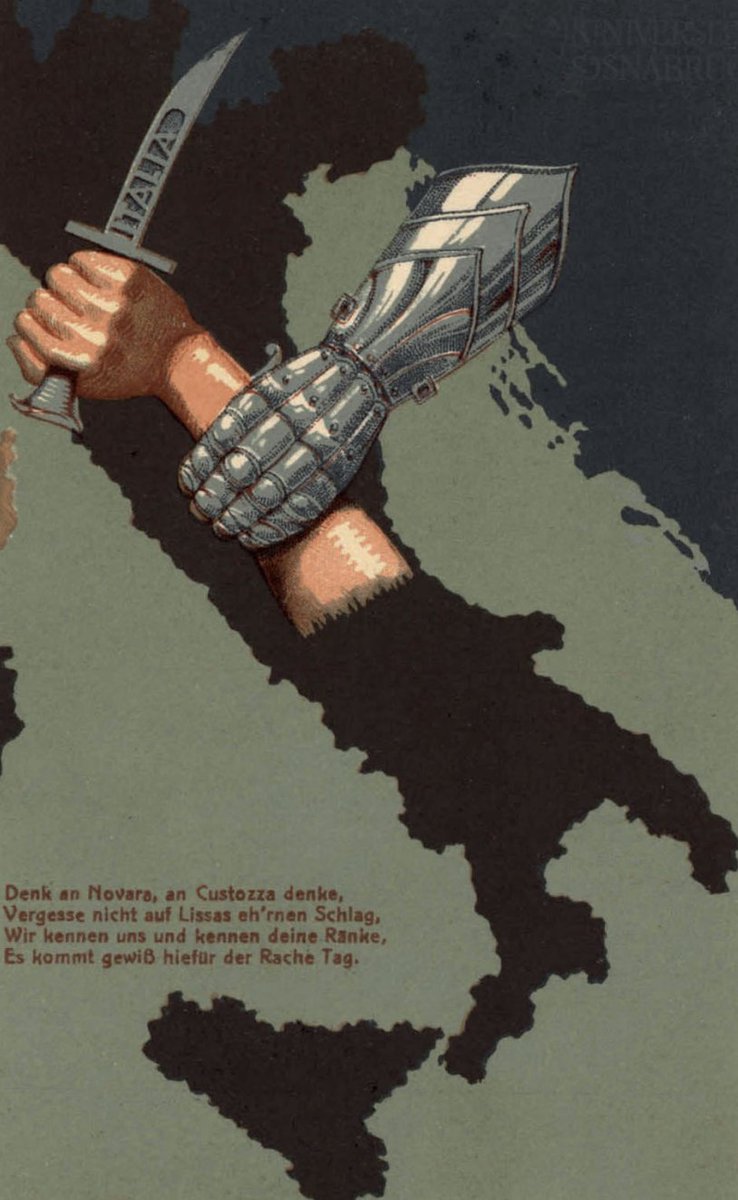 There's a small poem referencing historical battles that supposedly demonstrate Italian treachery. The text reads: βThink of Novara, think of Custozza, Don't forget Lissa's ironclad. We know each other and know your schemes, The day of vengeance will certainly comeβ.