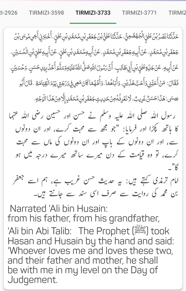 g) In another Hadeeth, Abu Sa'eed (may Allah be pleased with him) narrates that the Messenger of Allah (peace and blessings be upon him) said: "Al-Hasan and Al-Husain are the leaders of the youth of Paradise."