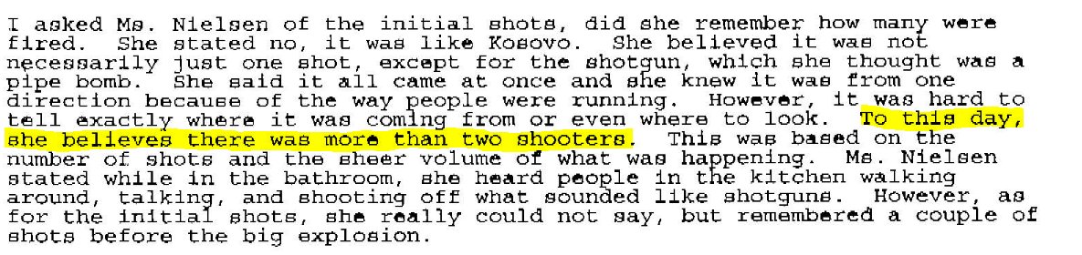 Perhaps most frightening are the sightings of a shooter with "spiky blonde hair" "between 30 and 40 years old" accompanying Harris, made by multiple witnesses. Repeated mention has been made of a shooter in a tie-dyed shirt.