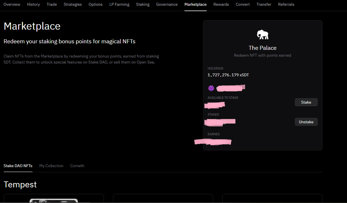 🔸L’onglet Marketplace ! Celui-ci nous permet de stacker nos $xSDT dans le “palace” pour gagner des points nous permettant d’obtenir des #NFTs d’une grande valeur car ceux-ci donneront accès à des stratégies uniques ! 🔥