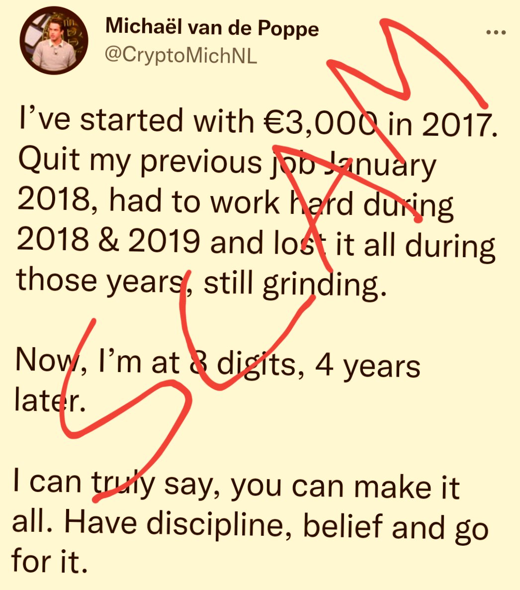 Scammers like @CryptoMichNL will tell you their sob Story and lure you in their Paid Group.