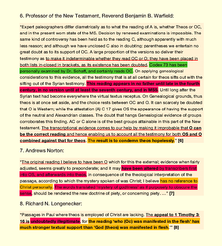 When reading the original Codex Alexandrinus for 1Timothy 3:16, Westcott, Fenton, & Tischendorf, -The highly recognized scholars & experts in the field- did NOT find the word โGod" in there..What they actually found written was the Greek word แฝฯ which means โheโ or โwhoโ