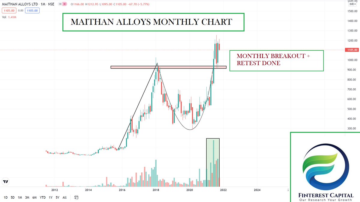The stock gave a rounding bottom pattern breakout with very strong volumes after 3 years on consolidation phase. It even retested it perfectly on low volumes.