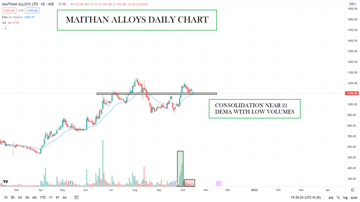 The stock recently broke its previous swing high on great volumes. It has been consolidating near 21 DEMA on low vols. This makes it a perfect risk reward long candidate.