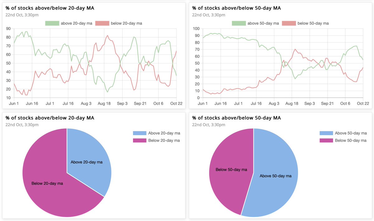 Other than FMCG index, the uptrend is intact. Smallcap index losing momentum. Most indices forming bearish engulfing or dark cloud cover on weekly charts. Market breadth nearing oversold on short-term charts.