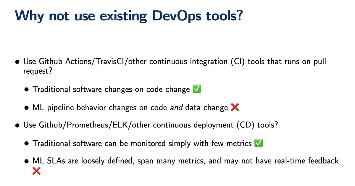 Even with Great Computational Resources, sustaining production ML is hard: the tech/tool stack is complicated, and almost nobody is an expert on the end-to-end pipeline. You need CI, or the ability to continually validate that the pipeline does what you expect it to do. (3/10)