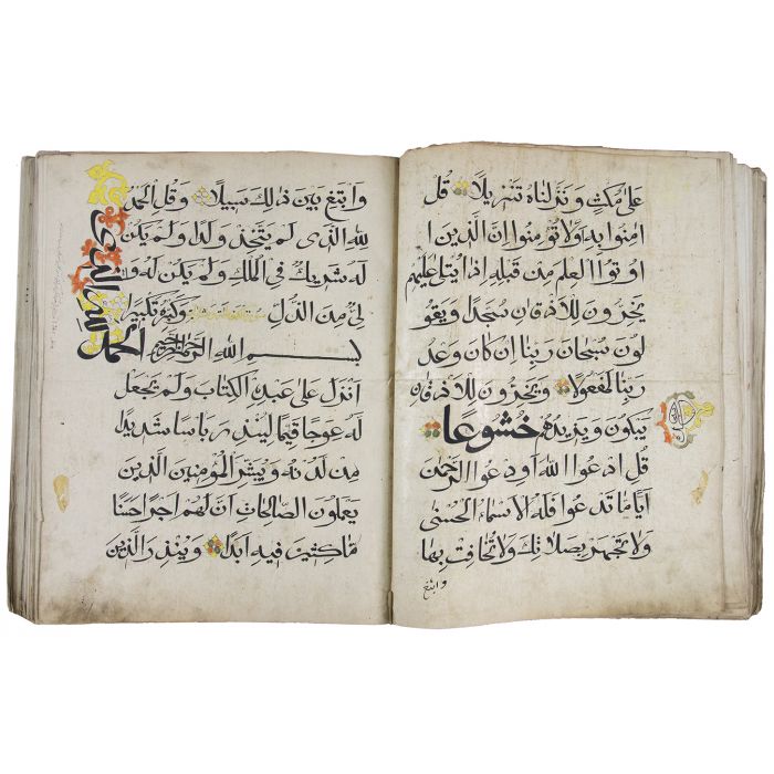A rare 18th century Qur'an from Dagestan or the North Caucasus, with many of the distinctive features found in Islamic mss of this region - unusually large format (a massive 42cm x 33cm), bold and sometimes flamboyant calligraphy, rosette verse markers, and carpet pages. 1/