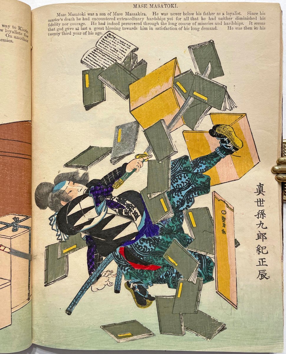 This 1885 edition, printed in Japan but aimed at the English-speaking market, has 50 fine colour woodblock-printed illustrations and one very large folding coloured plate (measuring 74 x 38 cm) showing the famous revenge scene. 2/