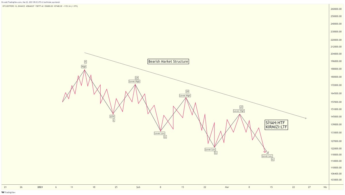 Genellikle HTF>LTF olsa da küçük zaman dilimindeki hareketler yavaş yavaş büyük zaman dilimindeki yapıyı değiştirecektir.