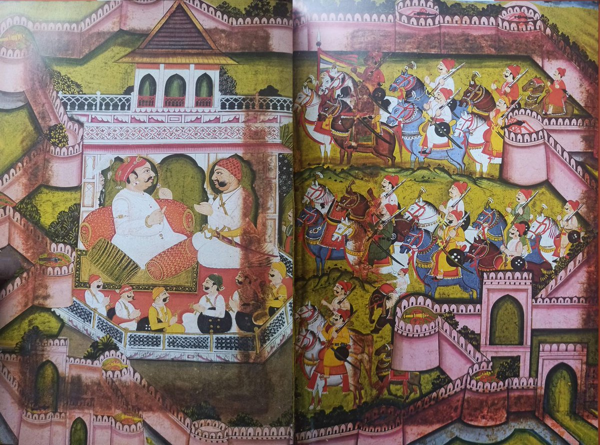 in Chandra Mahal of Jaipur. Ishwari Singh is shown as commanding figure on the left and Surajmal is listening to his command. The magnificent pink wall of Jaipur city is shown beautifully. On the right side is both the army of Surajmal within Jaipur state army.