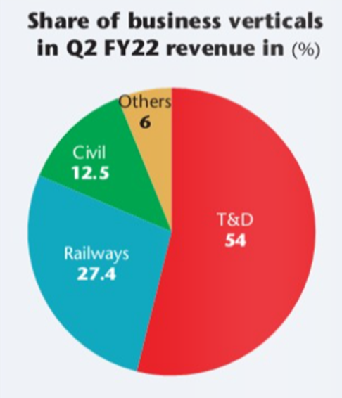 • Overseas market has dominant share of KEC’s T&D division contributing around 70% of revenue.
