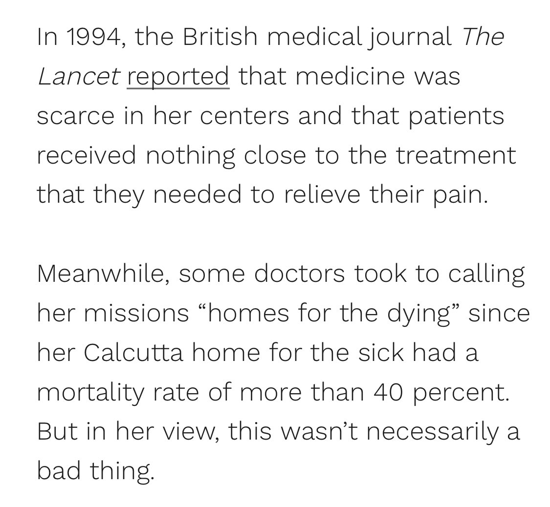 So, to sum it up: Theresa and her charity did not provide safe medical care, glorified the suffering of poor, sick Indians, saw conversion to Christianity (and not healing the sick) as their ultimate goal, took millions from questionable foreign sources, were not transparent