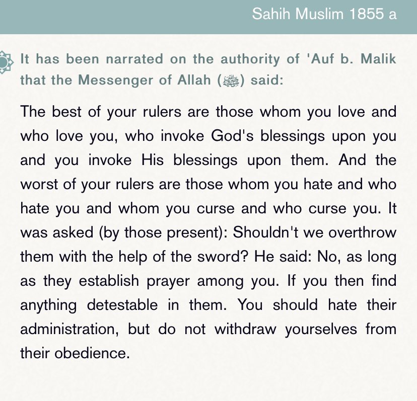 In another narration: “If anyone has a governor whom he sees doing anything which is an act of disobedience to Allah, he must disapprove of the disobedience to Allah which he commits, but must never withdraw from obedience.” [Muslim]