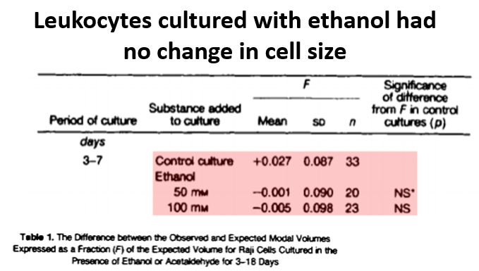 Interestingly, a 1993 study found that incubating myeloid or lymphoid cells in culture w/ ethanol had no effect on cell size.