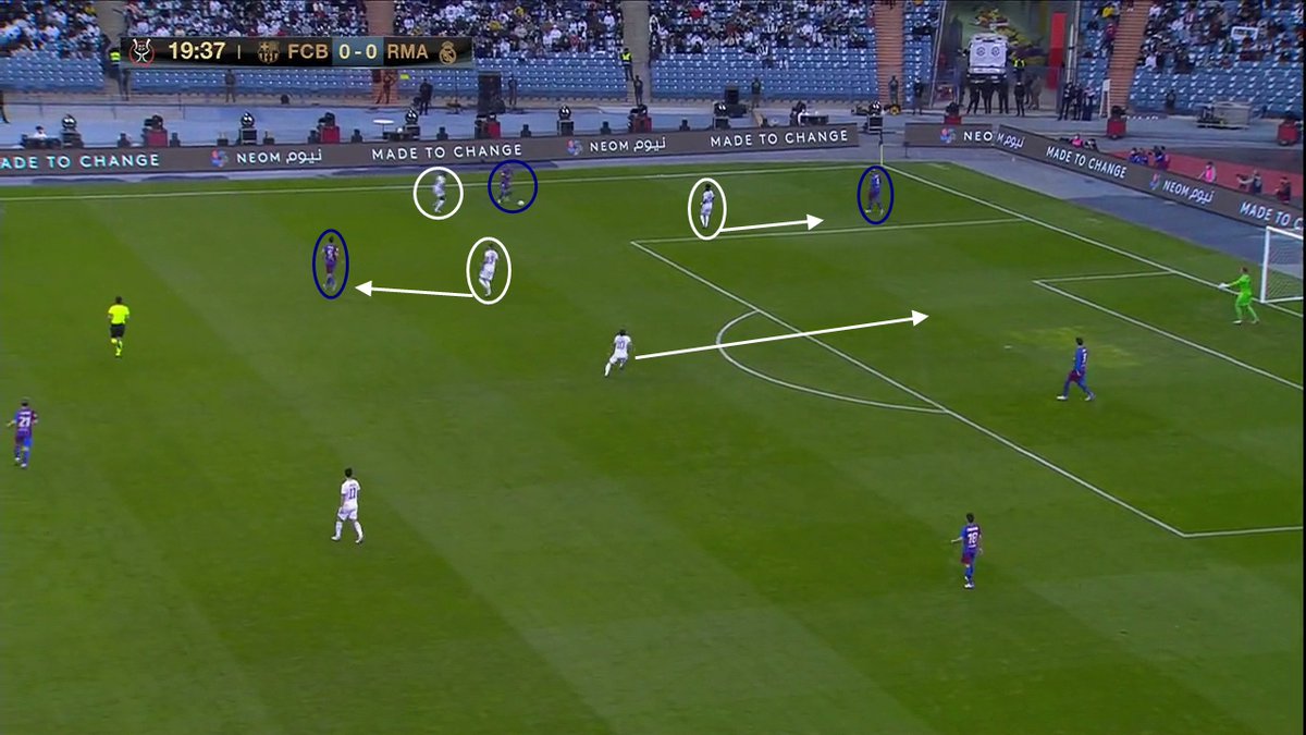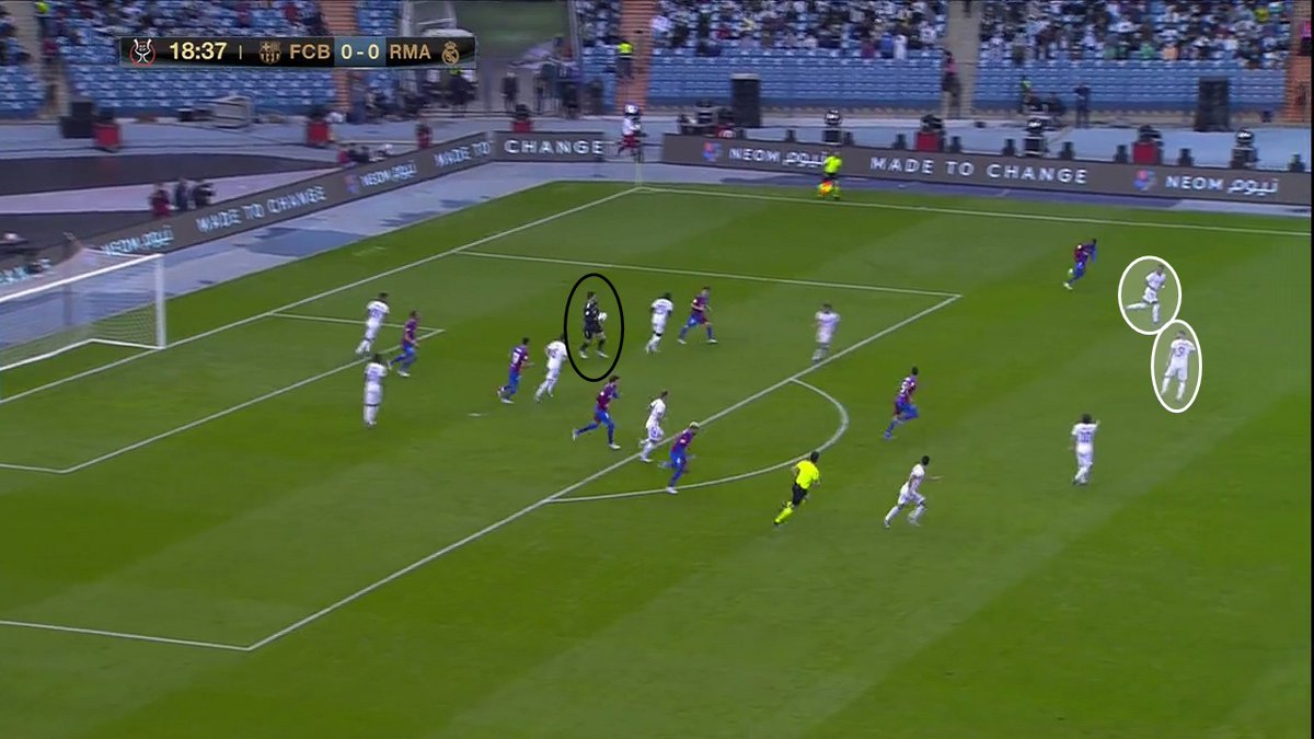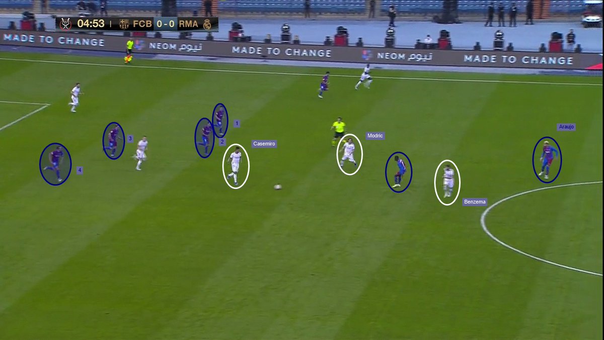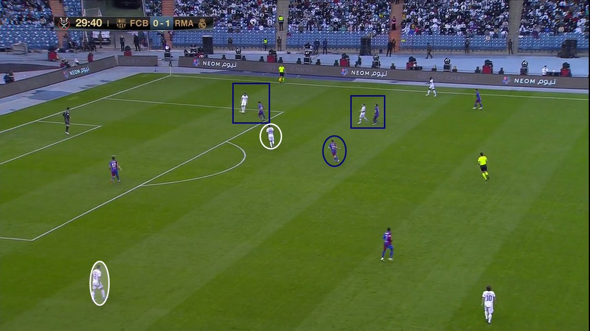 📍 Esa primera imagen que os dejo, como "portada" del encuentro, es la muestra de que Xavi para mi se equivoco en su plan de partido. Fue un plan que beneficio a su rival, en vez de contrarrestarlo y que le permitió al RM bordar una media hora de juego muy buena -y cómoda-.