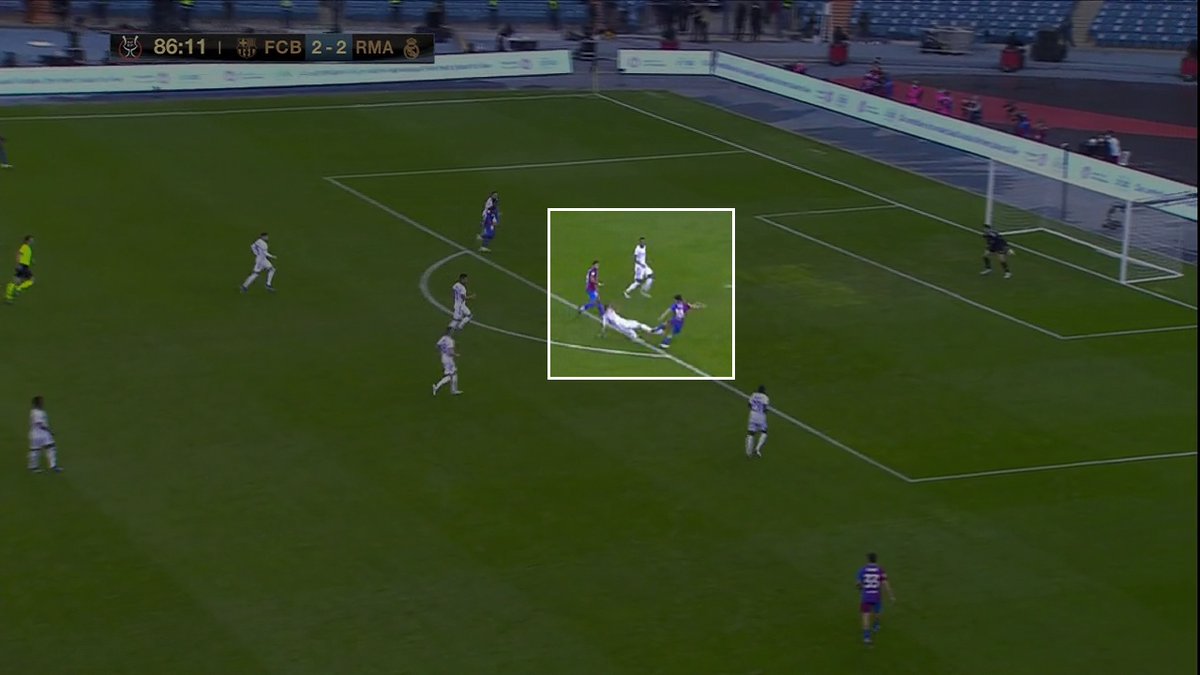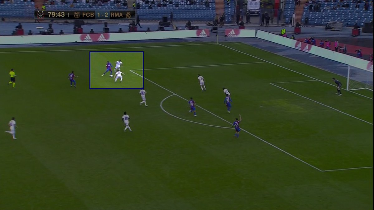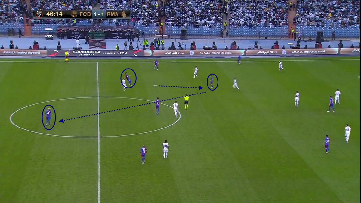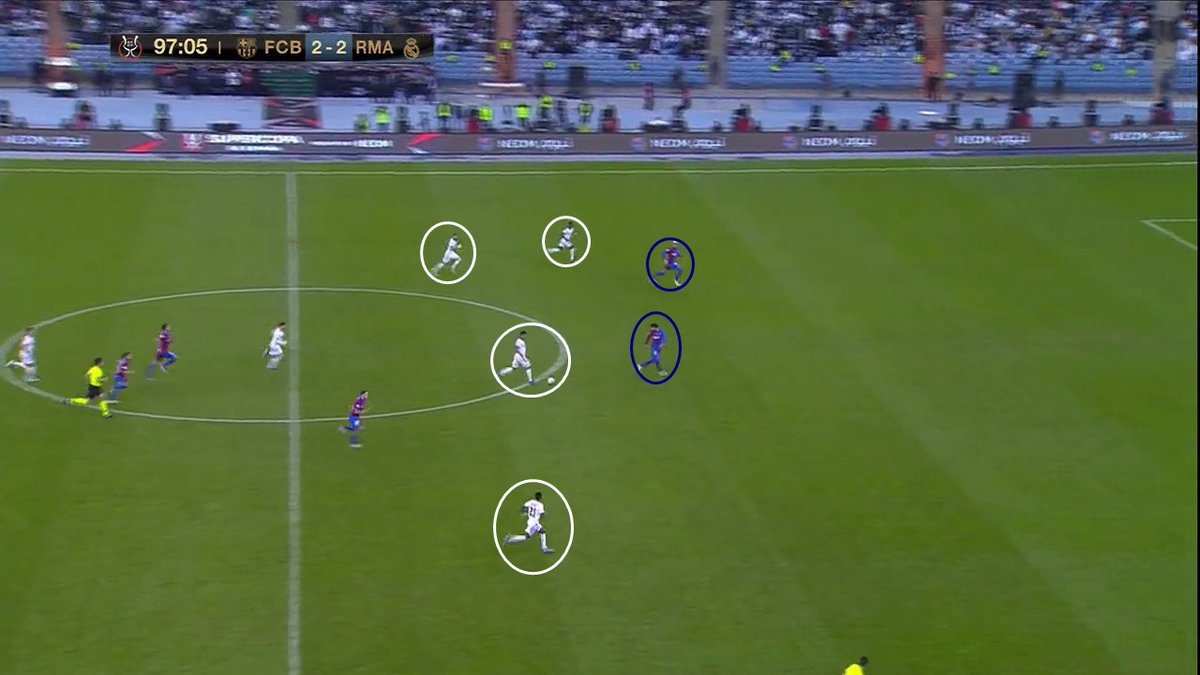 📍 Esa primera imagen que os dejo, como "portada" del encuentro, es la muestra de que Xavi para mi se equivoco en su plan de partido. Fue un plan que beneficio a su rival, en vez de contrarrestarlo y que le permitió al RM bordar una media hora de juego muy buena -y cómoda-.