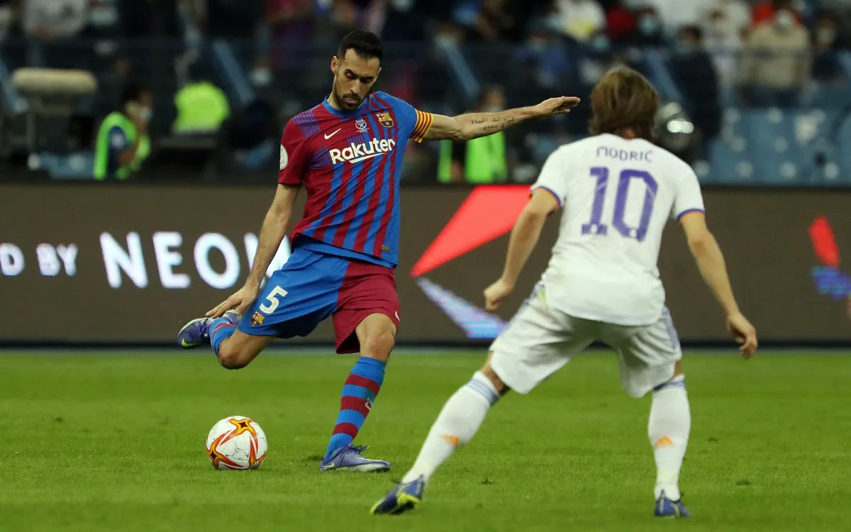 Araujo -> Busquets, but this time Busi has time & more breathing space from Benz to pick out passes.