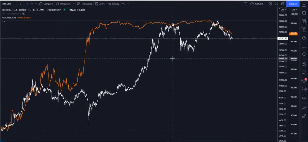 Market expectation is Fed to raise rates 4 times this year. $BTC v March eurodollar futures contract.