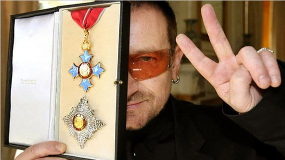 17. In 2007 Bono was given an honorary knighthood by the Queen of England for "his services to the music industry and for his humanitarian work". The illuminati stick together #Bono #Knighthood #Queen