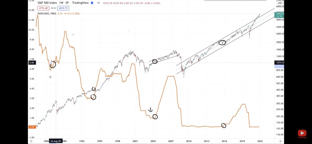 In this fed tightening chart from a video by @GameofTrades_ you can see that when the fed began tightening and it led to small corrections but the s&p still noved higher. Recession didnt occur until the fed tightening started to flatline. Big moved ahead