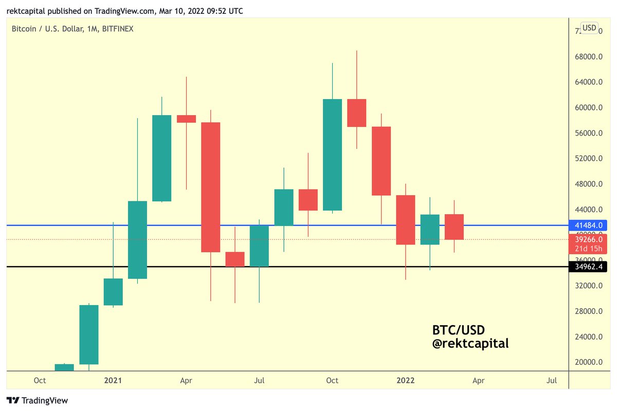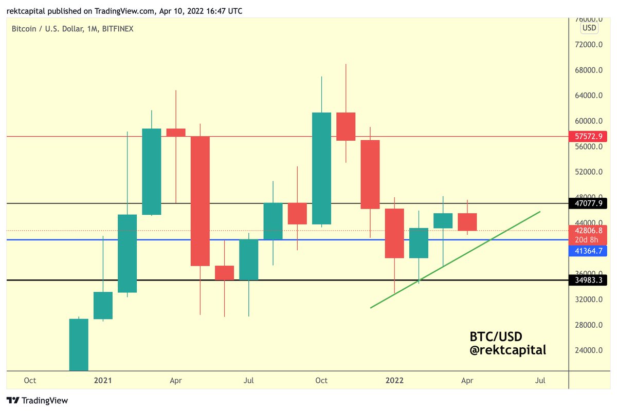 #BTC has performed a strong Monthly Candle Close above the blue level (~$41500) This means BTC is one step closer to fully reclaiming blue as support For BTC to fully reclaim blue as support, BTC may need to dip into blue for a retest attempt $BTC #Crypto#Bitcoin