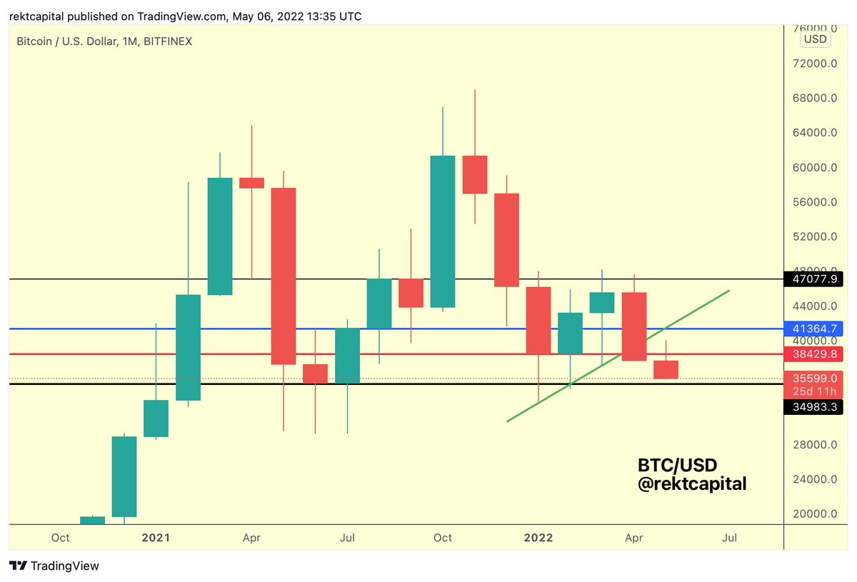 Unfortunately for #BTC, Monthly Closed below green Higher Low HL has been lost Also, red has been lost as support, most recently flipping into resistance This of course isn't definitive as the 1M Close is weeks away But BTC is close to revisiting black $BTC #Crypto#Bitcoin