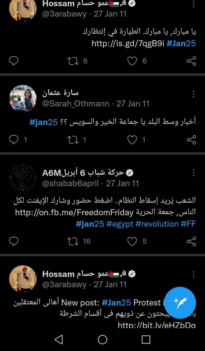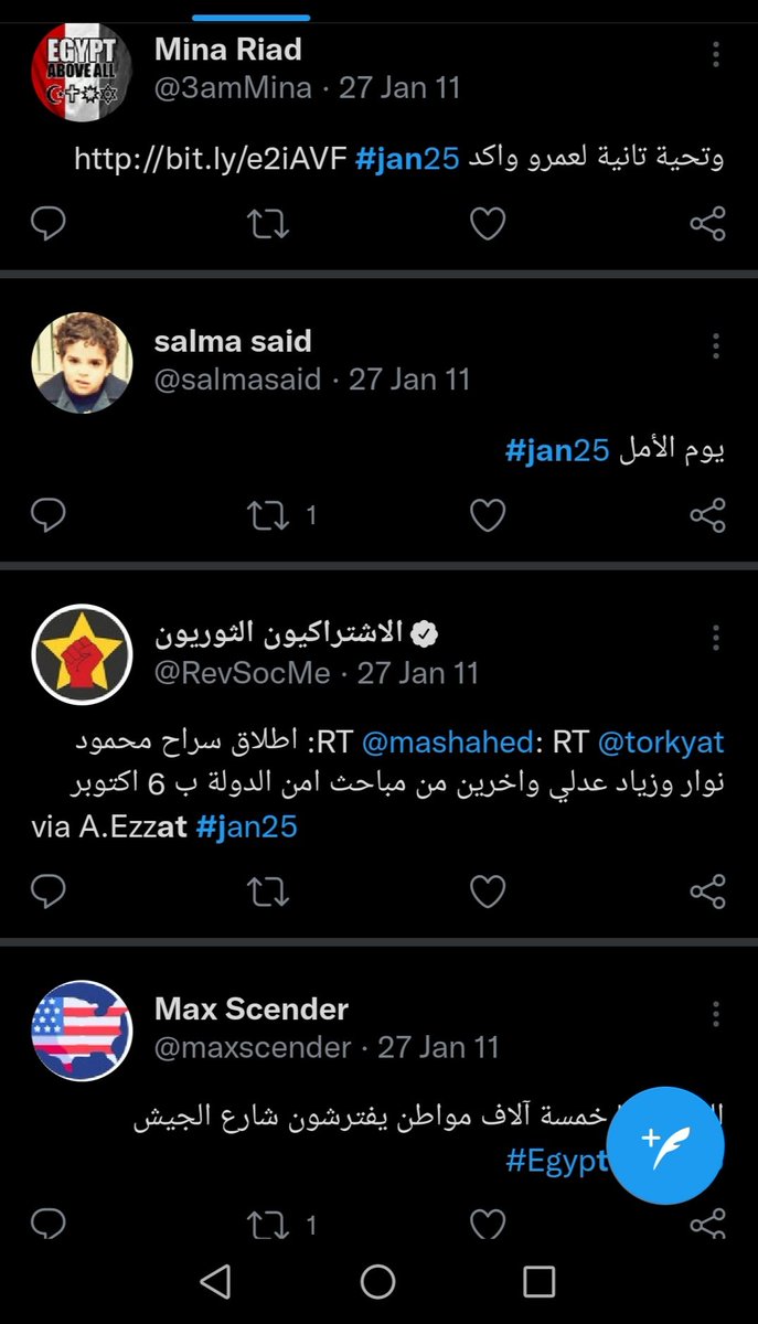 موقع تويتر وقف في مصر والاصابات بقت كتير بس عرفنا برضو ان في محافظات كتير نزلت بشكل مكثف خصوصا اسكندرية والسويس وعرفنا برضو ان مظاهرة مصطفي محمود كبيرة قوي وقربت تدخل الميدان