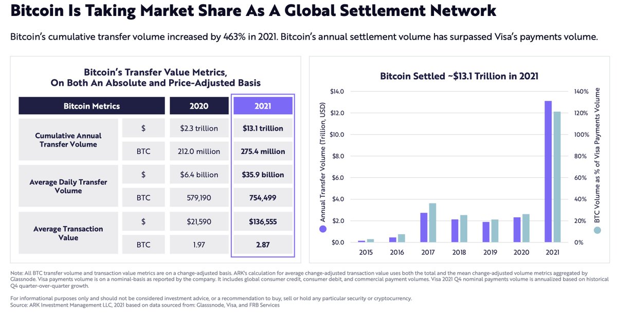 Bitcoin's annual settlement volume has officially surpassed Visa's. More than $13.1 trillion of value was settled on-chain in 2021.