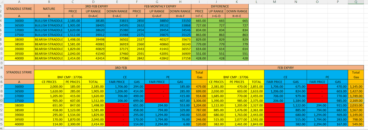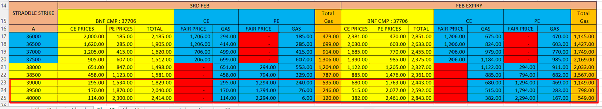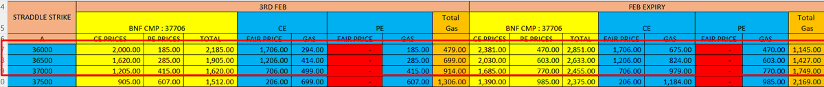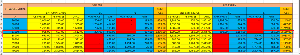 You can see I have made an excel starting from 36000 straddle to 40000 straddle. BNF is currently at 37700, so basically going up and down 1500 points approx and doing round number.
