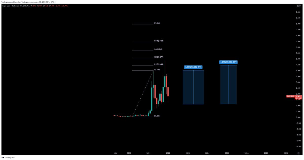 Sur mes positions LT, une strat que j'adore appliquer est le mix entre les extensions Fibo sur un horizon mensuel et les ruptures d'ATH. L'exemple qui me vient immédiatement en tête est celui de #ENJ, avec lequel je vous bassine depuis un moment.