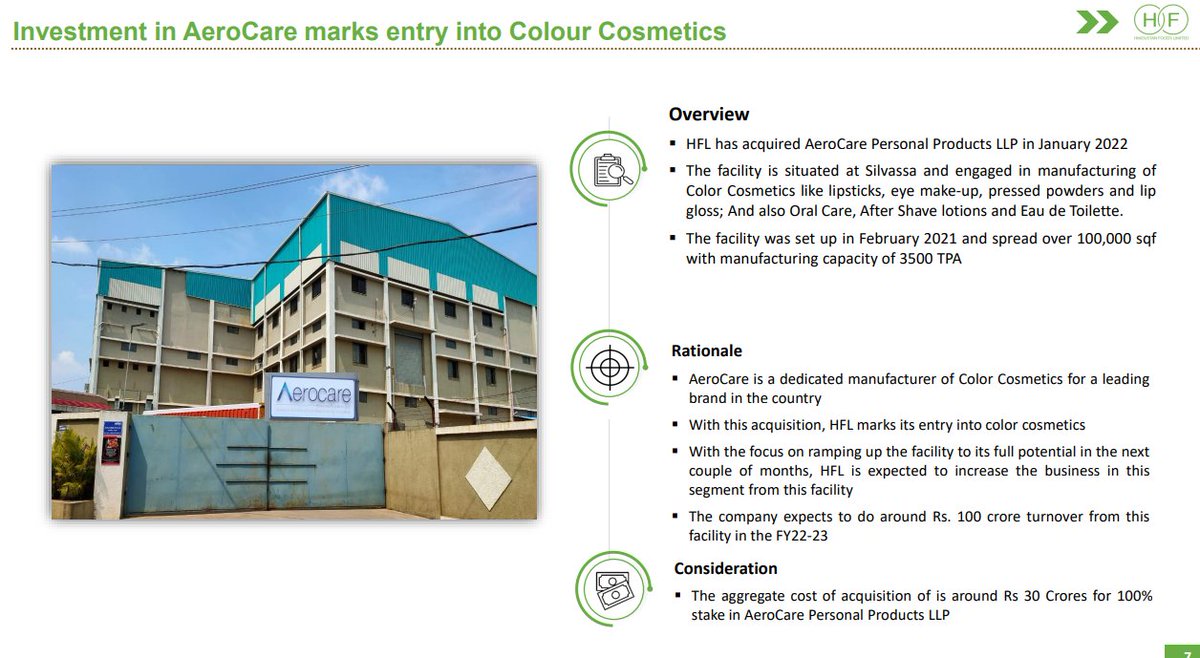 The company has invested in AeroCare Personal Products LLP. Aerocare is currently manufacturing various Colour Cosmetics like