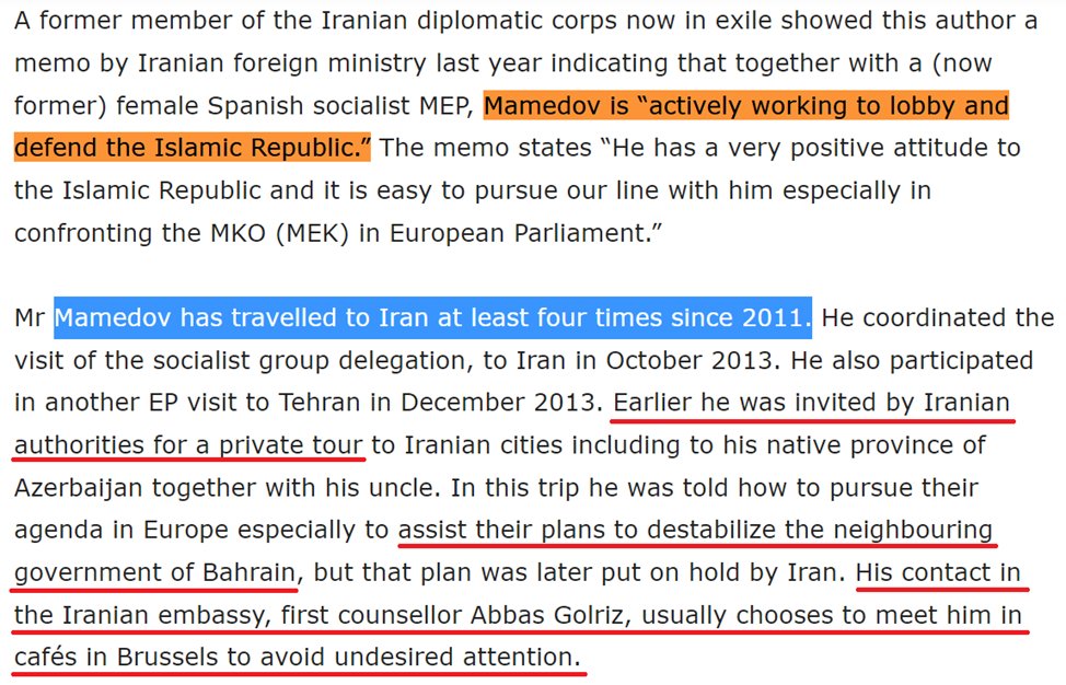 In 2014, in coordination with Iran’s embassy in Brussels, Mamedov drafted a European Parliament resolution “carefully worded to include some vague criticisms on human rights but to be entirely in favor of Rouhani and full engagement with Iran.”