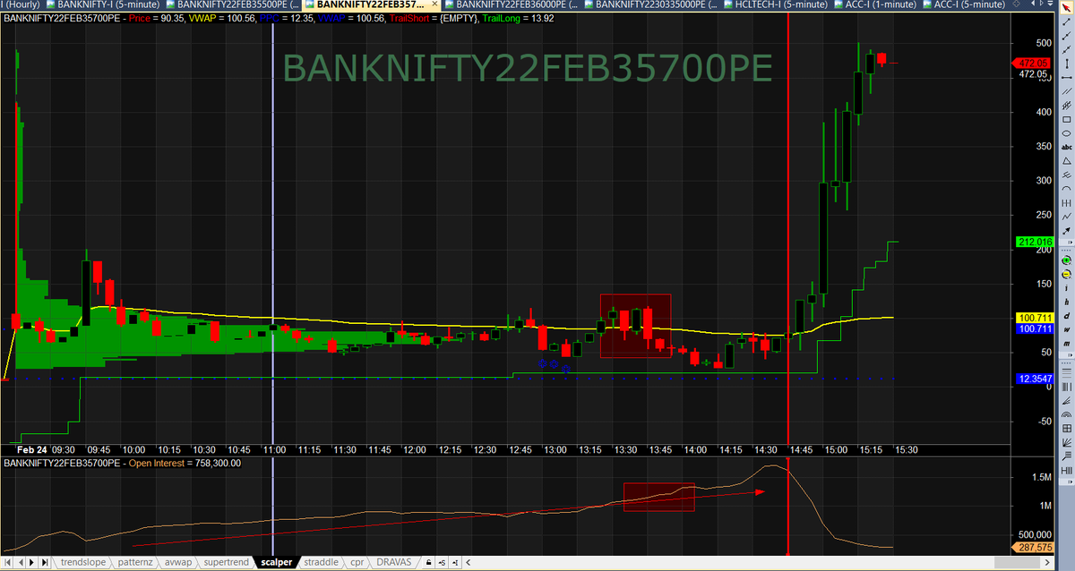 PE through out the day and around 1.30 PM - 1.45 PM, this PE crossed VWAP but the OI was not falling , instead increasing(marked in red box). Now see what started happening around 2.30 PM, u will see the OI is falling even when the PE is below VWAP.