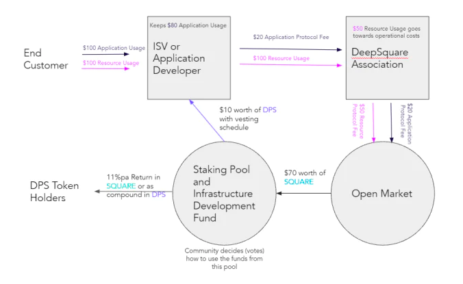 Les paiements sur cette marketplace se feront initialement en fiat et puis plus tard pourra être proposé avec leur token, 80% de l’achat ira directement au fournisseur de services d’apps ou au dev et 20% ira à l’achat de jetons $SQUARE, afin de créer une pression acheteuse.
