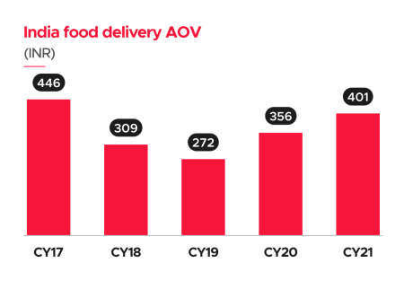 Cost of delivering an order for Zomato is more or less same, but it earns more on an order which is worth Rs. 500 than on an order of Rs. 100, & therefore higher AOV means more pfts for comp, AOV of zomato has risen drastically over the last few yrs.