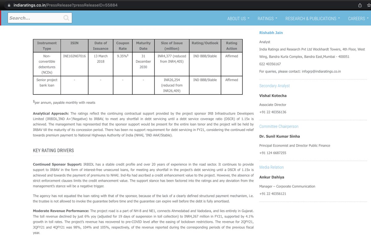 eg: for "IRB AHMEDABAD VADODARA SUPER EXPRESS TOLLWAY PRIVATE LIMITED" i go to its credit rating report indiaratings.co.in