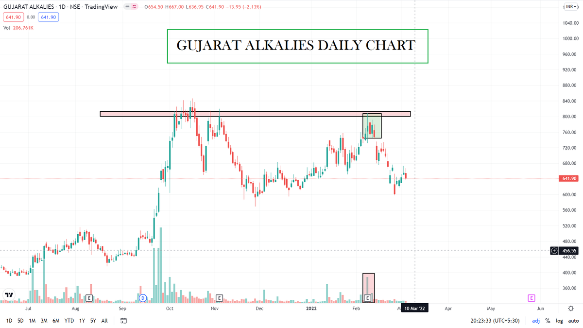 #Gujaratalkalies - Posted a blockbuster Q3. Co. posted highest ever Sales, EBITDA, Margins & PAT with huge jump both qoq & yoy. Despite such a great set the price couldn't cross previous high infact the stock formed kind of doji & saw a sell off with volumes which continued.