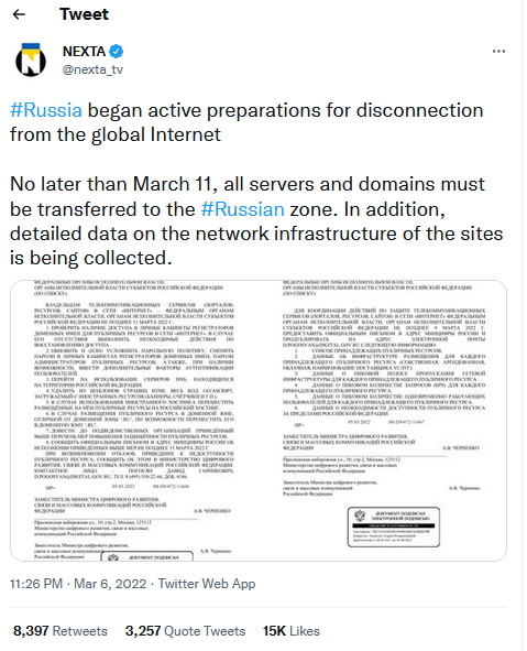 لكن الحكومة الروسية كانت قد بأت قبل سنوات بالعمل على انترنيت روسي محلي يؤمن عمل و اتصال جميع الشركات و البنوك داخل البلد فيما يسمى ب*رونت* #runet