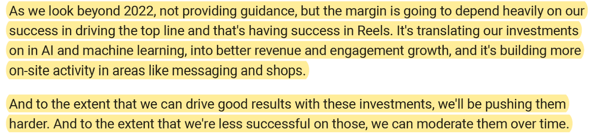 12/ "the core Family of Apps business will provide adequate capital to fund those investments and that also allow us to continue to repurchase stock. And we think we can offset the employee dilution but also continue to make anti-dilutive repurchases opportunistically"