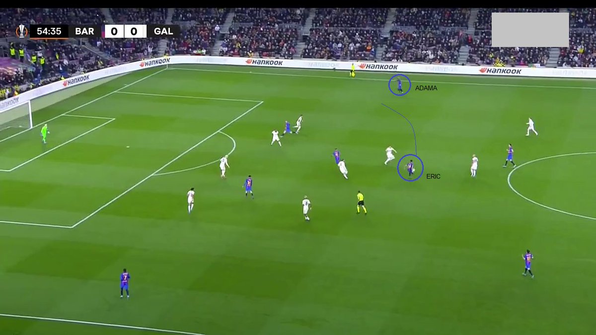 Más tarde, por la adaptación de los cambios al plan y porque Memphis no terminaba de ser preciso, Eric era directamente quien habilitaba a Adama. De nuevo en el FCB, el claro objetivo era llevarle el balón a los extremos en situaciones de 1x1.