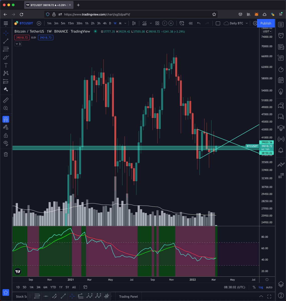 Bitcoin had a poor close on the weekly chart - breaking the triangle structure that had formed and at the same time closing under the cyan band of historical support / resistance. Additionally, the weekly RSI closed underneath the mean RSI line.