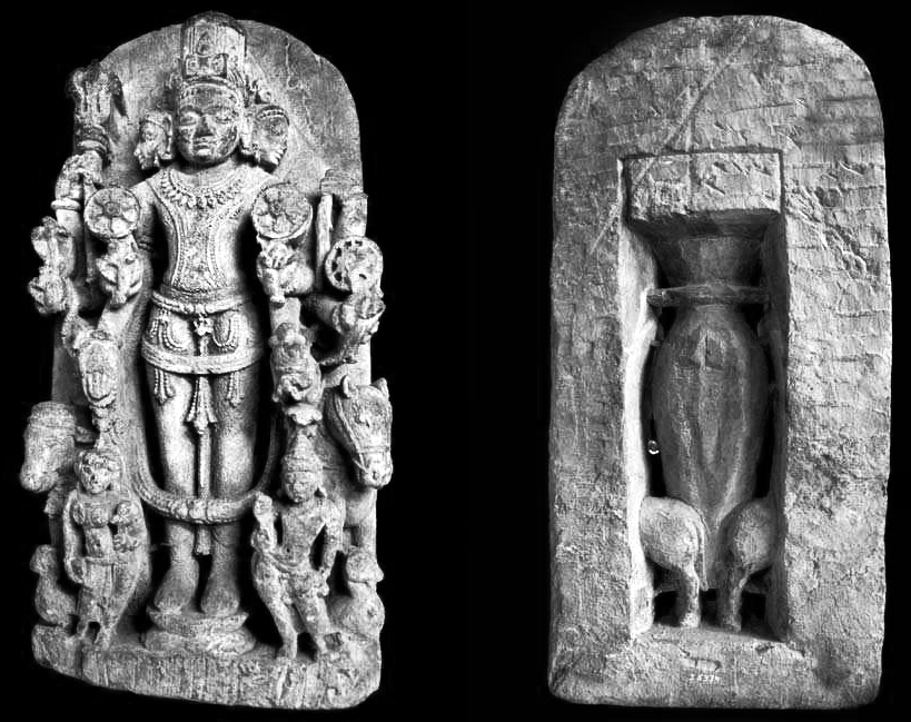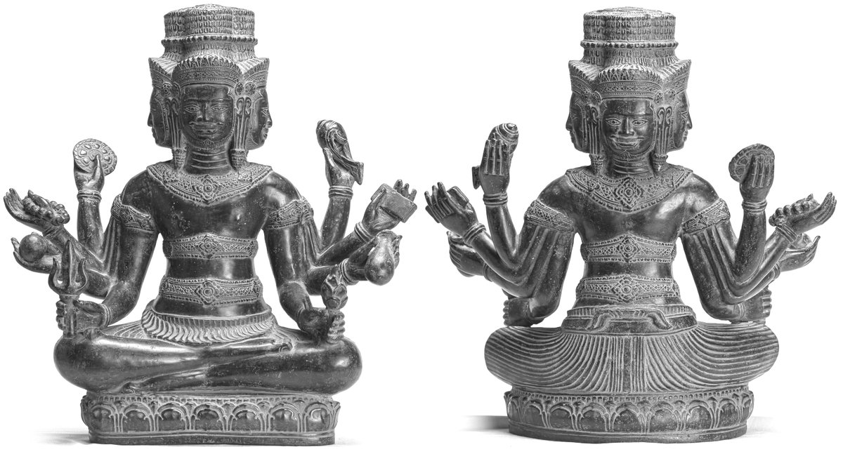 unique in this Khmer representation. hari: chakra& sha~Nkha; hara: trishUla& a~Nkura (common in east Asia); hiraNyagarbha: akShamAla& pustaka; sUrya: maNDala (sphere) & kamaNDalu that might also fit with brahman