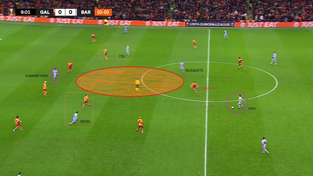 📍Ante las marcas individuales que propuso Dome sobre los tres centrocampistas del FCB, los da Xavi buscaron moverse para abrir un gran espacio en el medio y que Aubameyang lo aprovechara, mientras los interiores aprovecharan los que habían en la espalda defensiva.