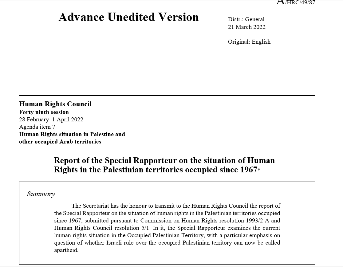 BREAKING: New United Nations report published today by UN Special Rapporteur @MichaelLynk5 concludes that the political system of entrenched rule in the occupied Palestinian territory "satisfies the prevailing evidentiary standard for the existence of apartheid"