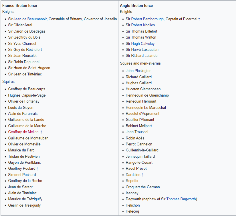 These are the knights who fought in this legendary tournament style battle! Beaumanoir commanded Breton and French knights while Bemborough's knights were mostly English and German mercenaries. What led to such large tournament instead of a single combat between the two captains?